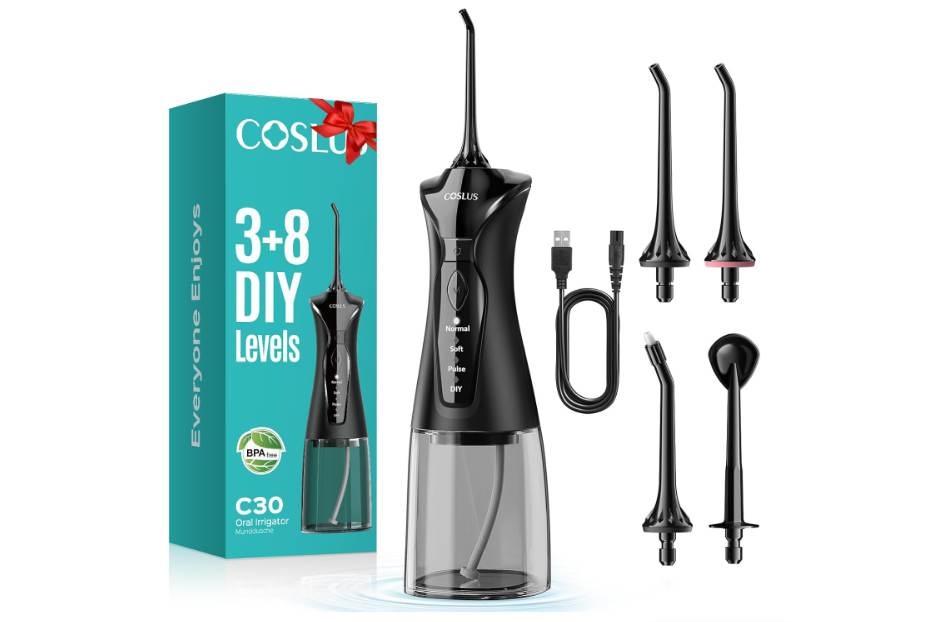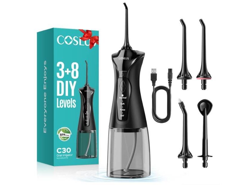 Le COSLUS C30 est un jet dentaire portable doté d’un réservoir de 300 ml, de 4 modes et de 11 intensités réglables. Ce réglage progressif permet d’adapter le nettoyage à différents profils : débutants, gencives sensibles, utilisateurs d’appareil orthodontique ou personnes qui veulent simplement compléter le brossage classique. Le produit intègre aussi une fonction mémoire, pratique pour retrouver automatiquement le dernier réglage utilisé.
