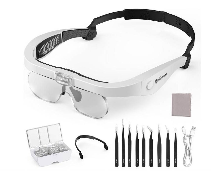 La loupe frontale LED rechargeable Lightswim est pensée pour les tâches de précision qui demandent d’avoir les deux mains libres. Elle fonctionne avec 4 lentilles interchangeables offrant des grossissements de 1,5x, 2,5x, 3,5x et 5x, ce qui permet d’adapter la vision selon le niveau de détail recherché. L’ensemble peut se porter comme des lunettes ou avec un bandeau, selon le confort souhaité.